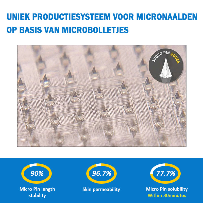 Each needle is0.27mm long, just 1/7th the thickness of a hair, and is made from dissolvable medication. These micro-needles are precision-engineered using cutting-edge manufacturing techniques to ensure a seamless, pain-free experience while effectively delivering the active ingredients directly into the skin.